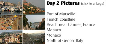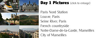 I took the Eurostar train from London to Paris. It was my first time going under the channel, and my first time on a high-speed train -- this one went 180 mph, which was very neat! I walked a couple miles through Paris (mostly along the Seinne) from Paris Nord to Gare de Lyon station. I took a very fast TGV train (200+ mph!) from Paris through Lyon and eventually to Marseille. The train system in France is excellent - better than the UK's, and really puts Italy's to shame - more on that later.