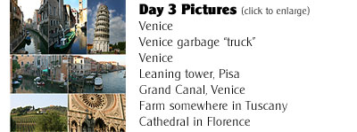The 3rd day was the longest, most eventful, least relaxing, and probably most exciting. I left the hotel around sunrise and explored a very empty Venice. WOW! I've been to a lot of places and I've never seen anything like Venice. Well, I take that back -- I've been to the Venetian hotel in Las Vegas and was amazed by it, but that wasn't nearly as spectacular as the real thing.