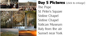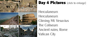 Right now I am in Vatican City, the world's smallest 'country'. This morning I woke up in Naples, walked through the ruins of Heracleum, climed to the top of Mount Vesuvius, and took a train to Rome, where I spent the past 4 or 5 hours visiting some of the major sites. Wow. Too much to say. You'll have to wait until Friday for a full description.