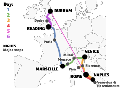 I'm mostly packed and ready to go. My train from London Waterloo to Paris leaves tomorrow at 12:09pm. I booked a room in Rome for Tuesday night with easy access to Ciampino airport (where my flight leaves Wed. at 6:55pm). And I'm planning to meet a friend in Derby on the way home from Durham on Thursday. Otherwise, I still don't know yet where I'm going or what I'm gonna do between Saturday afternoon and Tuesday.
