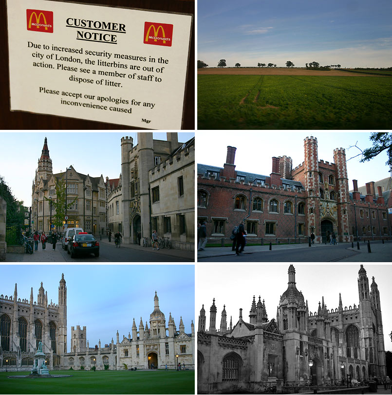 The ride from Norwich to Cambridge was very nice, and looked a little different from the rest of England. It was some of the flattest land I've ever seen. When I arrived in Cambridge, it took some walking to get to a place where I could see something, but when I finally did I was VERY impressed. Cambridge was a bit more impressive than Oxford, and a lot less crowded. It's definitely one of the most attractive cities I've seen in Britain, right up there with Durham and Edinburgh.
